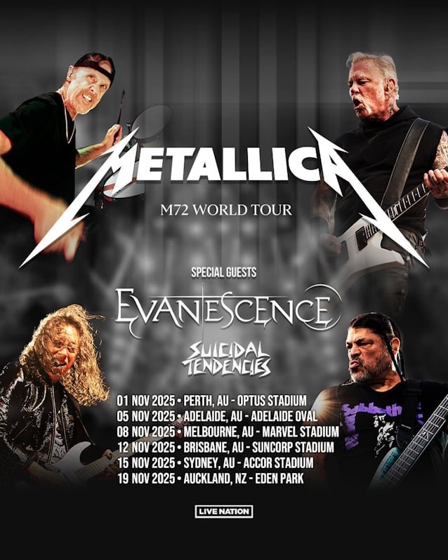 The Australia and New Zealand leg of METALLICA‘s “M72” world tour, with support from EVANESCENCE and SUICIDAL TENDENCIES, will kick off on November 1, 2025 in Perth at Optus Stadium, then head to Adelaide on November 5 at Adelaide Oval. Next, the tour moves to Melbourne’s Marvel Stadium on November 8, followed by Brisbane’s Suncorp Stadium on November 12. On November 15, the band will perform at Accor Stadium in Sydney, wrapping up the tour in Auckland on November 19 at Eden Park.