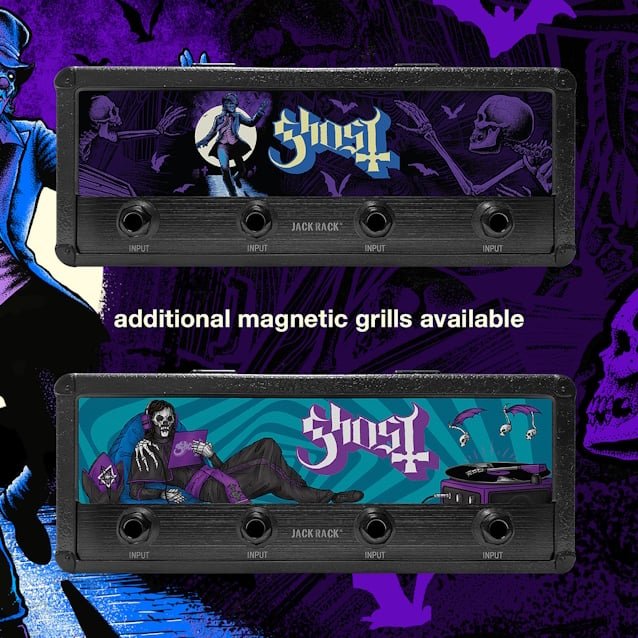 The officially licensed GHOST Jack Rack channels the band’s unmistakably haunting aesthetic. Made with real amplifier parts, this wall-mounted key holder is both a functional daily accessory and a darkly stylish collectible for fans of the band. Each purchase includes four branded guitar plug keychains and a wall mount kit for easy install. Two swappable magnetic faceplates are also available for those who want to mix things up with even more ghoulish flair.