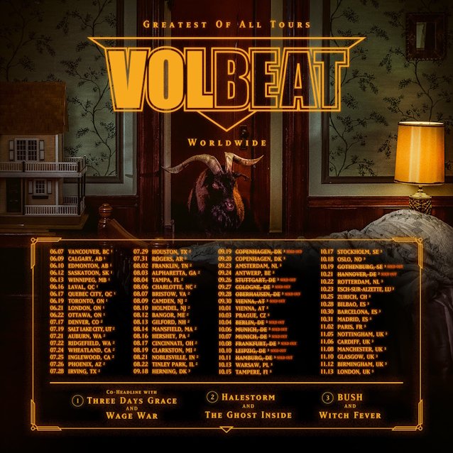 VOLBEAT‘s “Greatest Of All Tours Worldwide” is launching with a co-headline Canadian run with THREE DAYS GRACE and special guests WAGE WAR, which will be followed by headline treks in the U.S. with special guests HALESTORM and THE GHOST INSIDE, and Europe with special guests BUSH and WITCH FEVER, including a second show at Copenhagen’s Royal Arena on September 20.